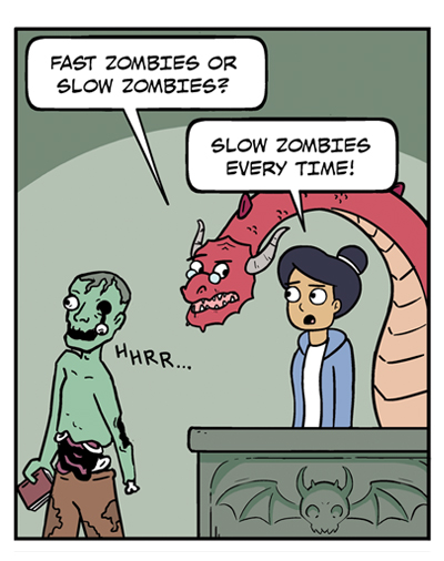 Another problem with “fast” zombies is: They are DEAD and prone to falling apart. Slow can maintain their body, but Fast just wears it out quicker :{