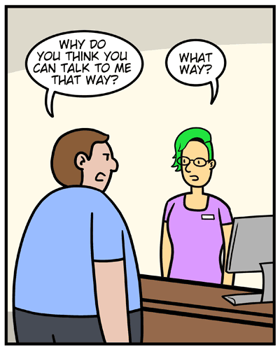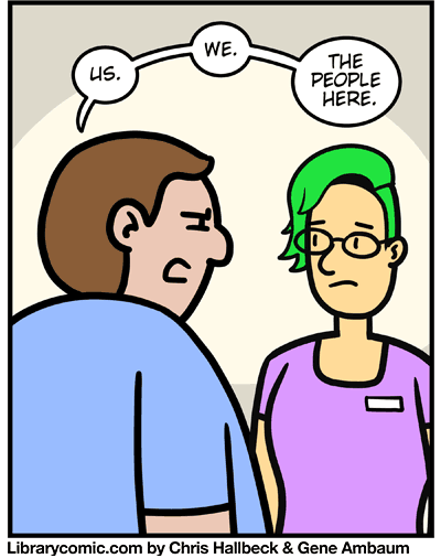 which one? I mean yes the library patron is incredibly rude and entitled, but the replies from the clerk are not that great either.
