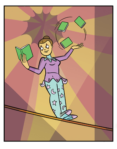 First panel juggling :} Bookmarks for series following on my desktop. Phone has eBooks when out of the house. Bookshelves next to reading chair in the bedroom. Even a small stack in the living room. In fact, the t-shirt wearing right now is Latin for ” so many books, so little time”.