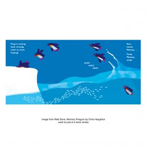 Mommy penguin goes off to catch fish while the young penguin and its dad watch. The little penguin needs some reassurance that mommy is coming back, and there’s a lot of discussion of how awesome mommy is (plus a harrowing moment or two with hungry seals). Houghton’s drawings (I assume they’re digital) and especially their colors plus the book’s unusual font give this a unique look that drew me in.