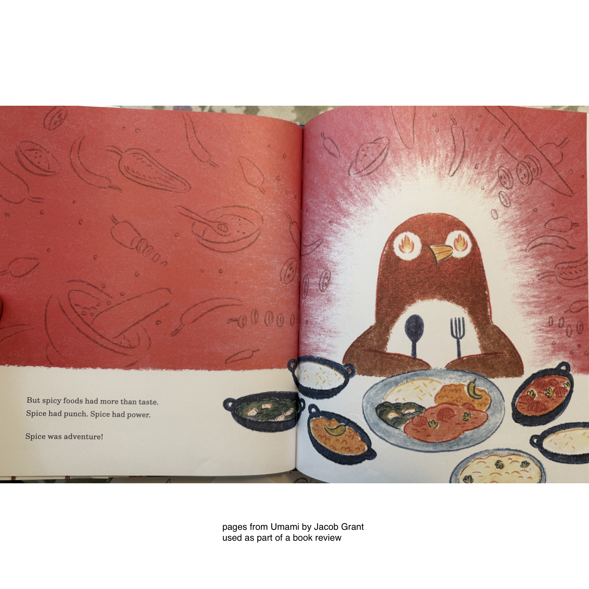 Umami (a penguin) is tired of eating cold fish, so she sets out on an adventure. She travels and eats foods with lots of different flavors, and then she decides to bring those home for the other penguins to try.
